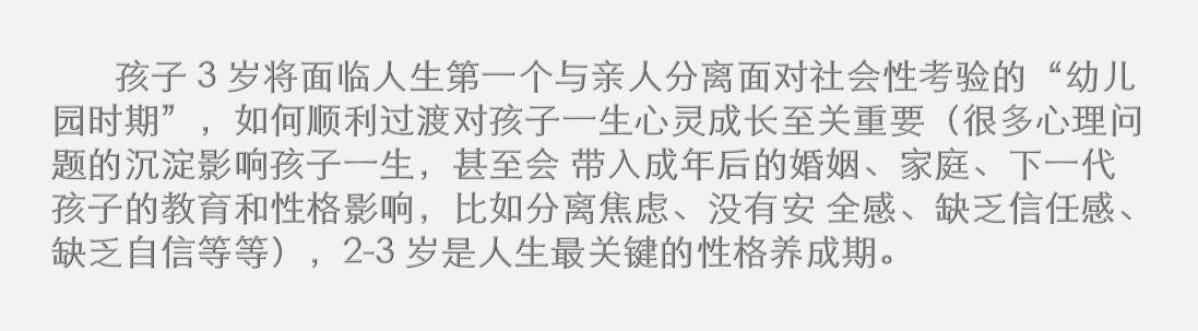 中国第一个以艺术训练为教育理念,建立良好的学习兴趣和生活习惯的半天班;抓住1.5-3岁儿童大脑发育的“黄金时期”,结合儿童敏感的身心发展特点,课程活动对您的孩子获得独立、秩序感、服从、解决问题的能力和必要的社会沟通能力,帮助他们适应幼儿园生活环境是必要的。